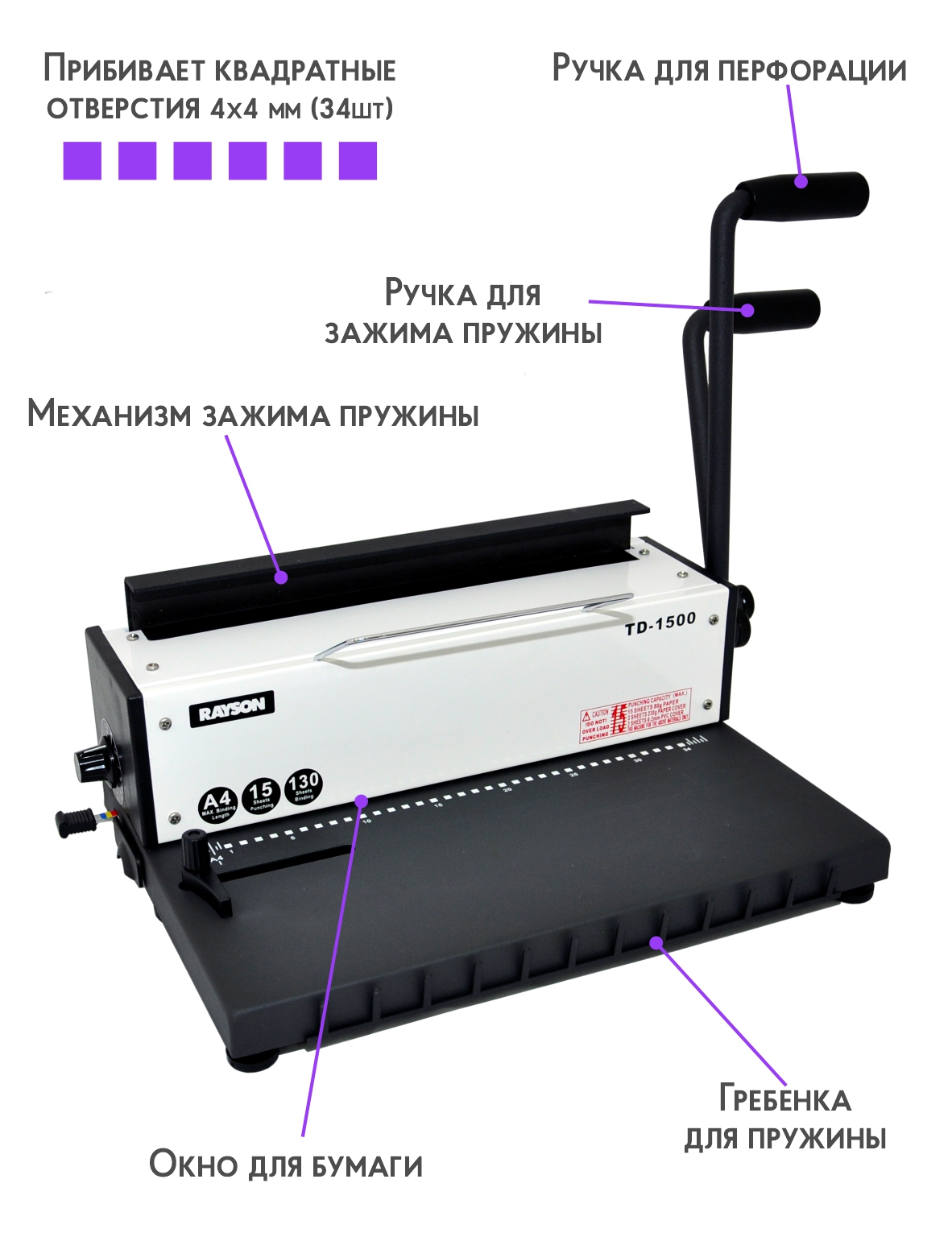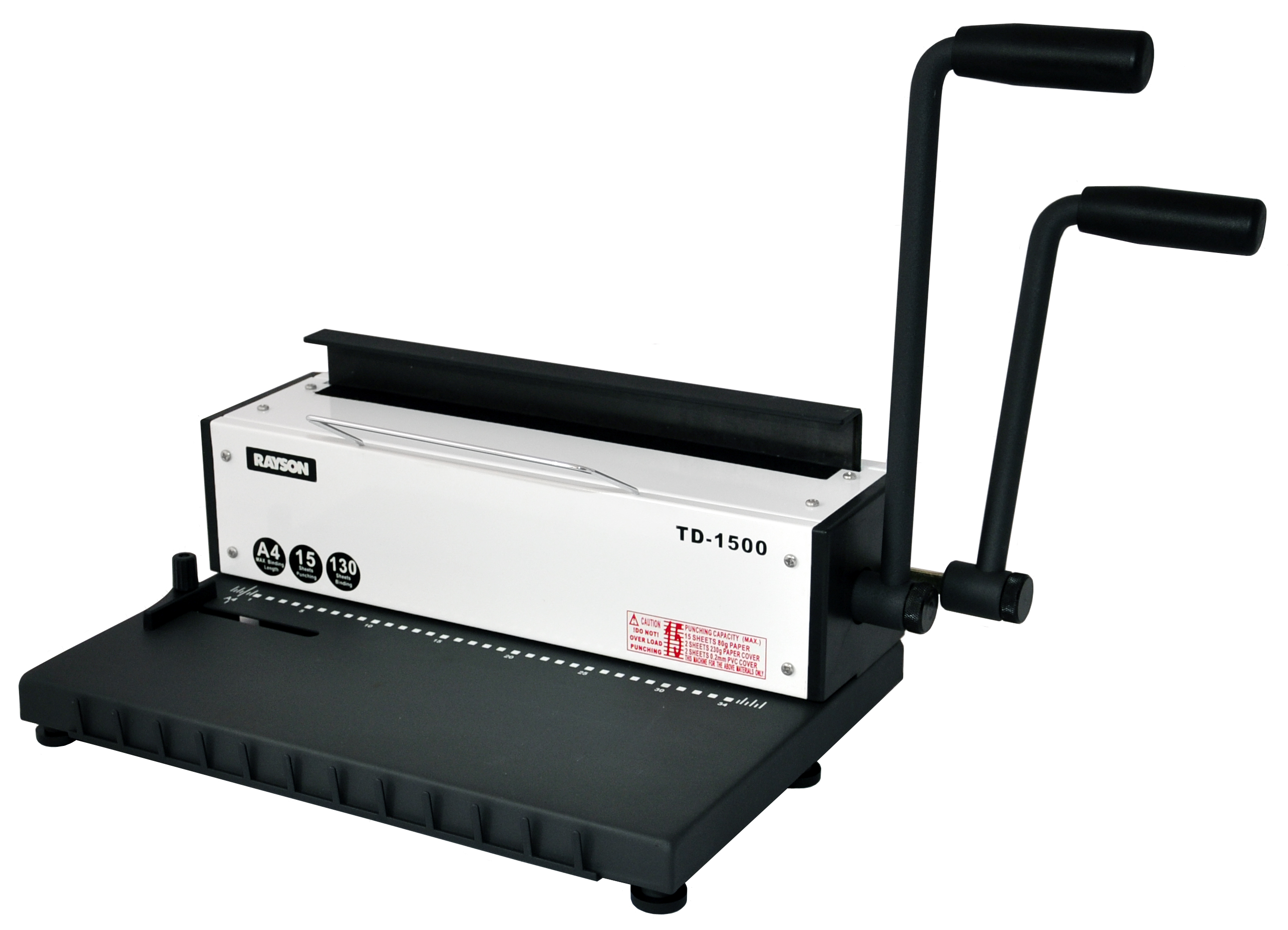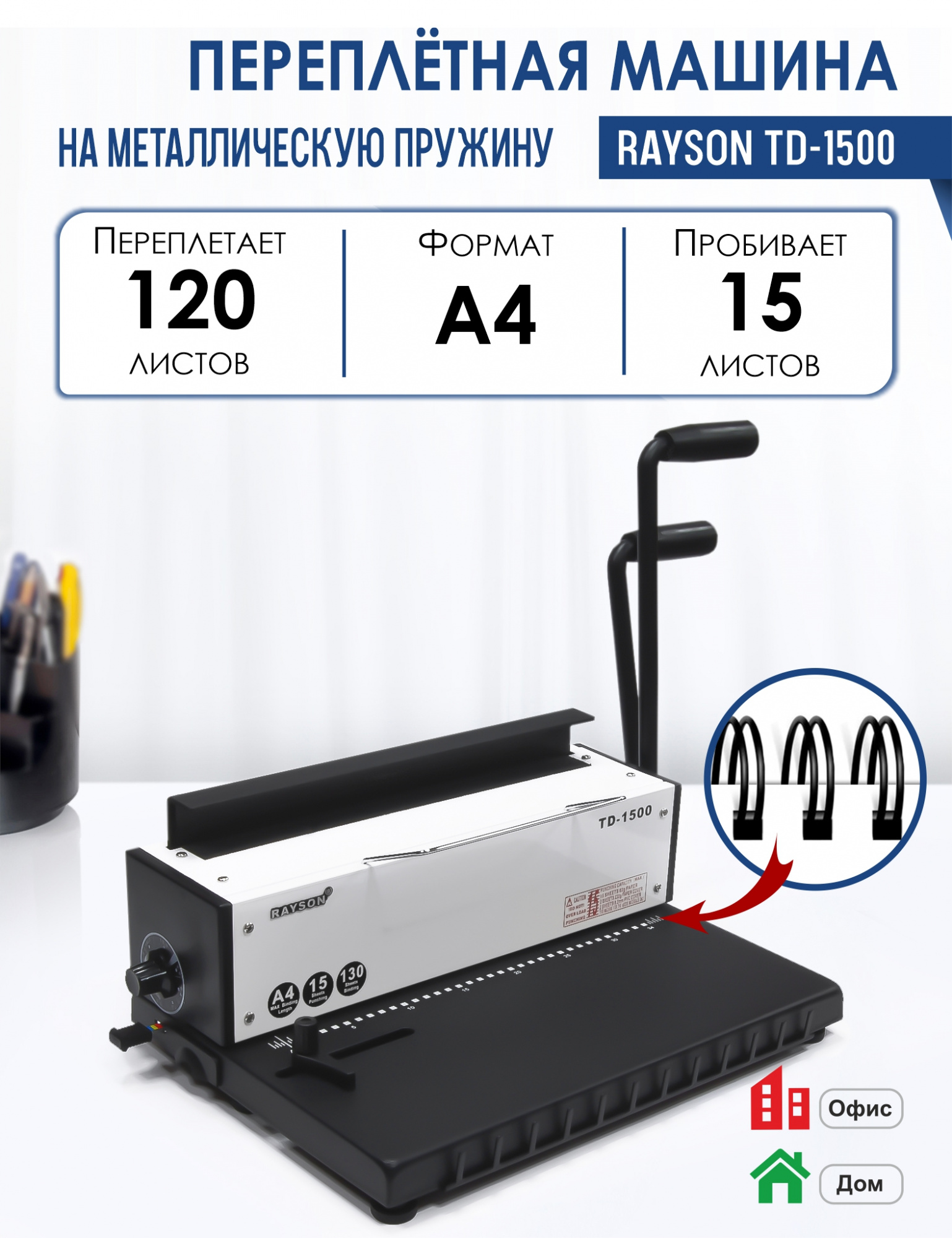 Переплетная машина на металлическую пружину от компании Rayson с удлиненным рабочим столом. Недорогая модель брошюратора, с помощью которой можно переплести до 120 листов, оснащена ручкой для перфорации отверстий в бумаге и отдельной ручкой для сжатия пружины. Машинка пробивает квадратные отверстия. TD-1500 подойдет для компаний и организаций со средним объемом работ.