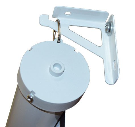 Изящный тонкий цилиндрический белый корпус закрепляется на стене или потолке. Надежный подпружиненный механизм позволяет легко выдвигать, фиксировать и сворачивать полотно.
