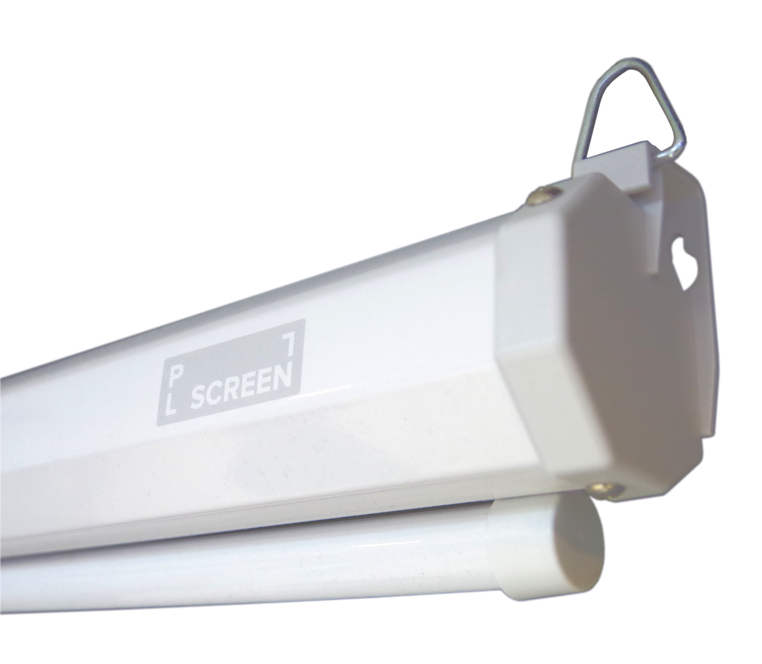 Изящный тонкий восьмигранный белый корпус закрепляется на стене или потолке. Надежный подпружиненный механизм позволяет легко выдвигать, фиксировать и сворачивать полотно.