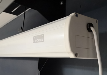 Настенный/потолочный экран с электроприводом. Формат 4:3; Рабочая диагональ 305 см (120"). Рабочая область 244x183 см. Черная кайма сверху 15 см, снизу 3 см, слева и справа по 3 см. Белый корпус. Полотно Fiberglass Matte White.
