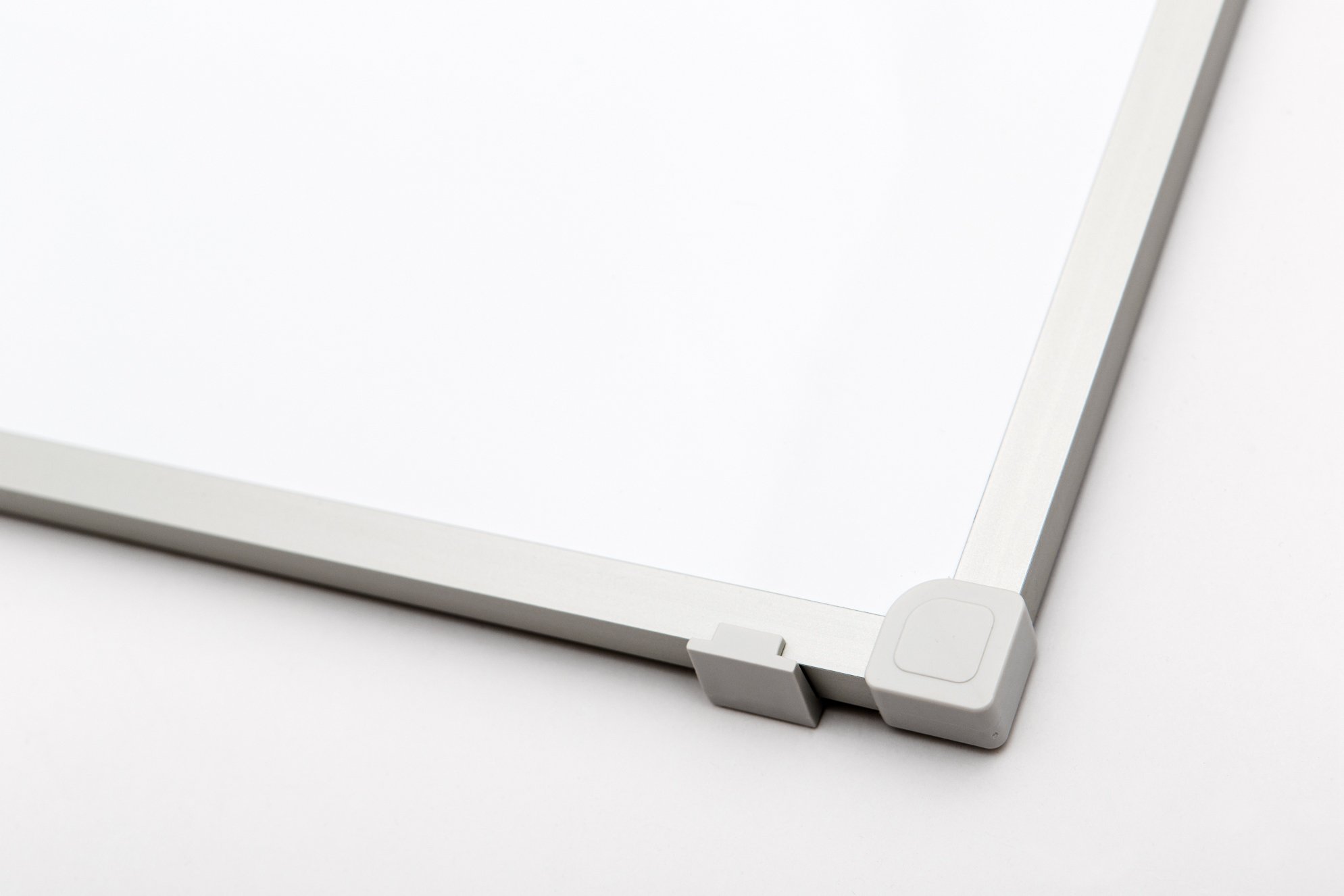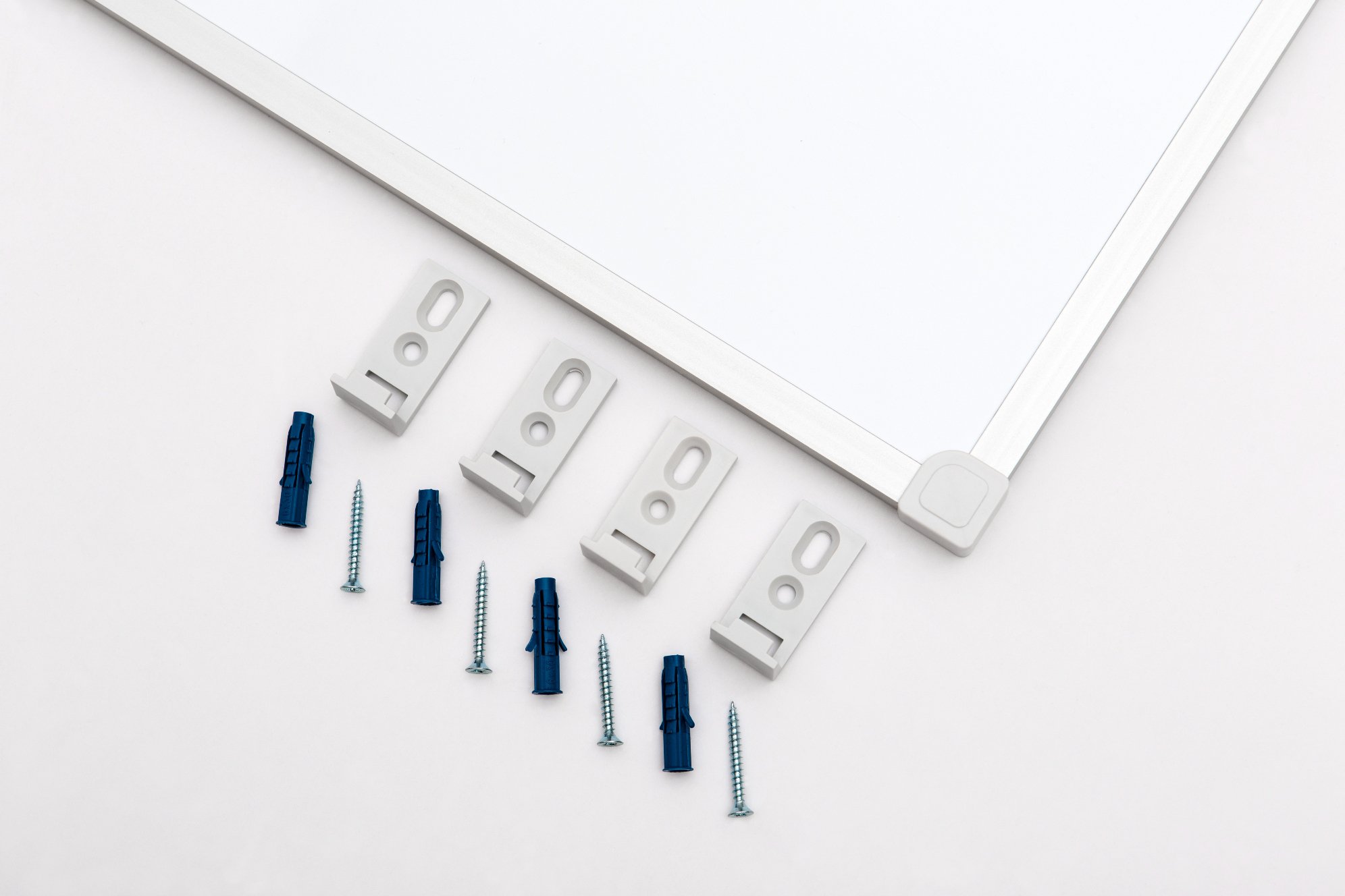 Маркерная доска в алюминиевой рамке LINE крепится при помощи пластиковых крепежных уголков, в которые она вставляется. Благодаря данному типу крепления, доску можно снимать со стены не выкручивая шурупы.